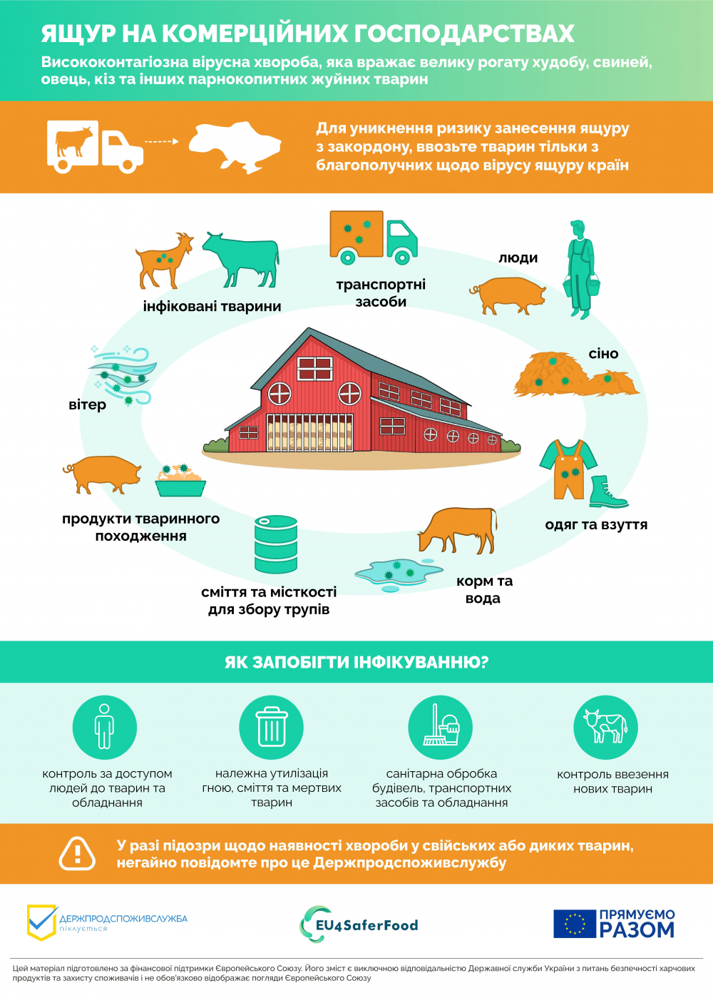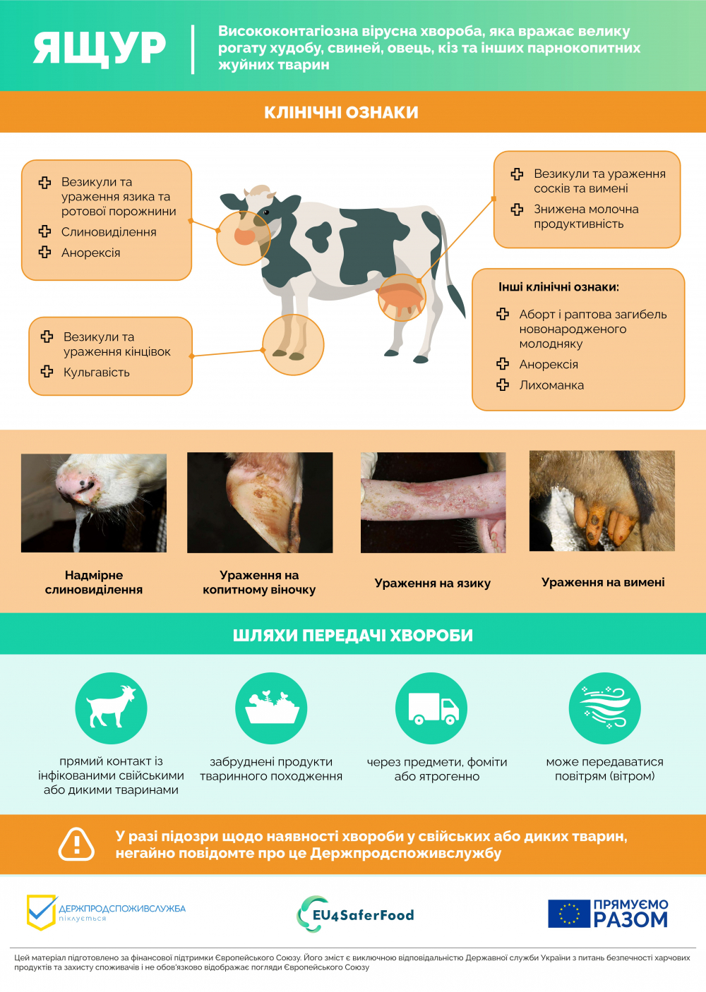 Ящур є одним із найнебезпечніших вірусних захворювань для тваринництва, адже вражає велику рогату худобу, свиней, овець, кіз та інших парнокопитних. У тварин хвороба проявляється підвищенням температури, утворенням характерних пухирців у ротовій порожнині, на язику, губах, вимені та копитах, слинотечею, кульгавістю та різким падінням продуктивності. Вірус передається дуже легко — як через прямий контакт між тваринами, так і через корми, воду, інвентар чи транспорт, а також повітряно-крапельним шляхом, інколи на значні відстані.